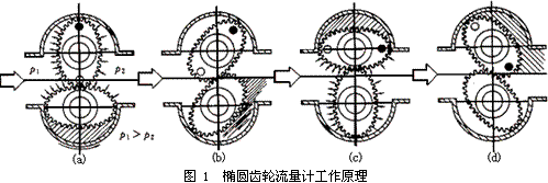 典型的PDF(橢圓齒輪式)的工作原理如圖1所示。兩個(gè)橢圓齒輪具有相互滾動(dòng)進(jìn)行接觸旋轉的特殊形狀。P1和p2分別表示入口壓力和出口壓力,顯然p1>p2,圖1(a)下方齒輪在兩側壓力差的作用下,產(chǎn)生逆時(shí)針?lè )较蛐D,為主動(dòng)輪;上方齒輪因兩側壓力相等,不產(chǎn)生旋轉力矩,是從動(dòng)輪,由下方齒輪帶動(dòng),順時(shí)針?lè )较蛐D。在圖1(b)位置時(shí),兩個(gè)齒輪均在差壓作用下產(chǎn)生旋轉力矩,繼續旋轉。選裝到圖1(c)位置時(shí),上方齒輪變?yōu)橹鲃?dòng)輪,下方齒輪則成為從動(dòng)輪,繼續旋轉到與圖1(a)相同位置,完成一個(gè)循環(huán)。一次循環(huán)動(dòng)作排出四個(gè)由齒輪與殼壁間圍成的新月形空腔的流體體積,該體積稱(chēng)作流量計的"循環(huán)體積"。
